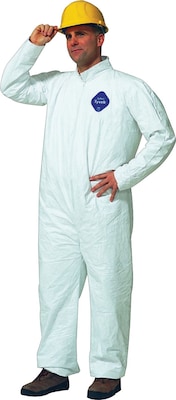 DuPont® Tyvek® X-Large Coverall in white color features front zipper, laydown collar and open ankles for easy movement while stretching/bending. Coverall is ideal for many applications and offers dry particulate protection, sold as 25 per carton.