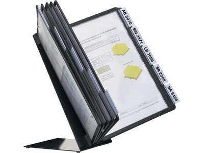 - Includes 10 easy-load pockets with black frames, 10 snap-on tabs, bracket, and a non-slip steel desk stand.