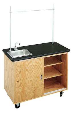 Diversified Woodcrafts Economy Mobile Lab Table made with solid oak with plastic laminate top features stainless steel sink, electrical outlet, 4" heavy-duty casters and much more making it durable, versatile and a good choice for college labs.