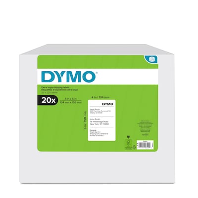 Quickly create extra-large shipping labels directly from your DYMO LabelWriter label maker with DYMO LW Shipping Labels. Using a direct thermal printing process, you avoid the hassle of expensive ink or toner. Packaged in rolls, so you can print one shipping label or hundreds with ease—no more messy sheets, waste, or sheet label jams. You receive twenty rolls of white, self-adhesive DYMO LW Extra Large Shipping Labels with 220 labels each. Labels measure 4-inches x 6-inches each.