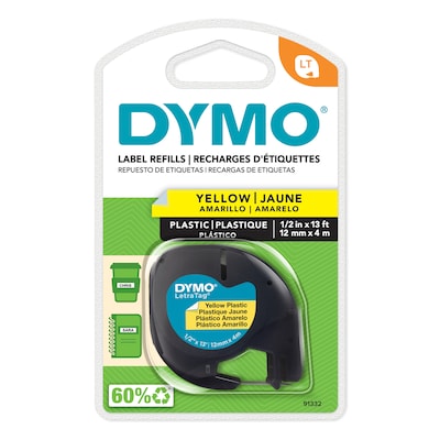Create labels with this DYMO LetraTag 0.5-inch black on yellow plastic tape that is designed to resist both chemicals and scratches.