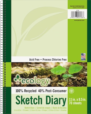 Recycled 60 lb. medium weight White drawing paper in a convenient sketch diary. Contains 100% total recycled content with 40% post-consumer fiber. Perfect for quick study sketches and drawings. Spiral bound to keep all of your drawings in one place.