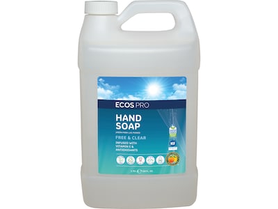 Crystal clear, plant-powered ECOS PRO Free & Clear liquid hand soap is formulated to lift dirt and grease, but gentle enough for even the most frequently washed hands. Infused with nourishing vitamin E and antioxidants, the hand soap moisturizes while protecting hands. A readily biodegradable, pH-balanced formula is made using sustainable, plant-powered ingredients. Made without dyes; gray water and septic safe. Recognized by US EPA's Safer Choice (DfE) and USDA's BioPreferred program.