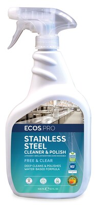 The ECOS PRO reliable and effective water-based formula cleans, polishes, and protects stainless steel surfaces. The cleaner will not leave streaks, hazing, or oily residues behind. Protects against water spots and fingerprints. Formulated to perform without harsh fumes. Excellent on other metal surfaces such as aluminum, brass, chrome, copper, zinc, silver, and mild steel. The biodegradable pH-balanced formula is made using sustainable, plant-powered ingredients, and is free of dyes; gray water and septic safe. Recognized by the US EPA's Safer Choice (DfE) and USDA's BioPreferred program.