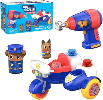 - Includes kid-friendly power drill, police motorcycle, sidecar, five snap-on parts, six bolts, Bolt Buddy Police Officer, and police dog pal figurine
