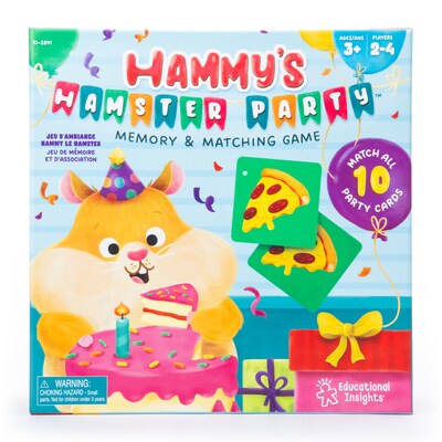 Help Hammy find them in this memory and matching game for kids ages 3+. How do you play Hammy's Hamster Party? The Hammy randomizer picks up a card when you press down on it. Then, players take turns flipping over game cards to find the one that matches Hammy's. If you find the pair, you keep it! If you don't, flip the card back over, but remember what it is! If a player flips over a piñata card, all players simultaneously flip cards until they find the one that matches Hammy's. Memory and matching games are a great way to practice attention skills, visual discrimination, and recall all during playtime! Games are also an easy way to teach kids sportsmanship, teamwork, and more social emotional learning skills. At Educational Insights we've been helping kids learn through play for 60 years. We work with experts in distinct fields to ensure that our products are the very best they can be. Our award-winning, best-selling toys and games—Kanoodle®, Design & Drill®, Playfoam®, GeoSafari®, and more—spark new interests, unleashing limitless possibilities.