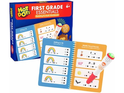 Independent learning really hits the spot with Hot Dots First Grade Workbook! Designed specifically for 1st Graders by educational experts, this set features an interactive, electronic Hot Dots pen with light and sound effects (and a mute button for quiet learning) and 100 pages of standards-based, foundational 1st Grade reading and math activities. Elementary classroom must haves. Kids review colorful, illustrated questions, then press the pen to any answer dot for instant, confidence-boosting feedback. And they can do it on their own! Kids can develop key skills, including letter and vowel sounds, addition, subtraction, and more, anywhere, anytime with this portable, self-paced, independent learning set. Hot Dots Pen requires 2 AAA batteries, not included.