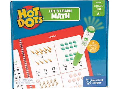 Build mathematics confidence with the Educational Insights Hot Dots Let's Learn Math workbook set! It contains everything you need for first-grade success! A full-color spiral-bound activity book includes 50 pages of mathematics activities. Lessons cover addition, subtraction, place value, geometry, and more, building academic confidence and creating the foundation for future success. Use the interactive Hot Dots pen with lights and sounds, enabling kids to learn and practice critical learning skills independently.