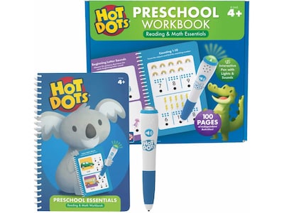 Independent learning really hits the spot with the Hot Dots Preschool Workbook, packed with reading and math essentials! Designed specifically for preschoolers by educational experts, this set features an interactive, electronic Hot Dots pen with light and sounds effects (and a mute button for quiet learning) and 100 pages of standards-based, foundational preschool reading and math activities. Must haves for preschool classroom. Kids review colorful, illustrated questions, then press the pen to any answer dot for instant, confidence-boosting feedback. And they can do it on their own! Kids can develop key skills, including letter recognition, letter sounds, counting, numbers, and more, anywhere, anytime with this portable, self-paced, independent learning set. Hot Dots Pen requires 2 AAA batteries, not included.