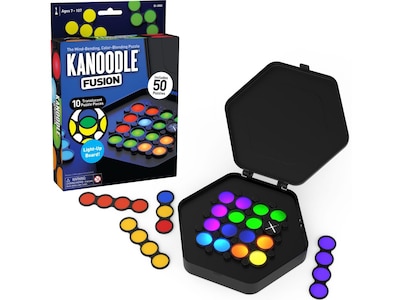 - Take this portable, game with you for fun on the go. Perfect for planes, trains, and road trips as well as restaurants, waiting rooms, and more. Includes Light-Up Kanoodle Fusion puzzle board/carry case, 13 translucent colored puzzle pieces, and puzzle book with 50 challenges to complete. Game requires 2 AAA batteries, not included