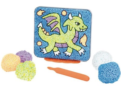 - Includes five colors, dragon themed canvas with divided sections, squisher tool, and stand for display