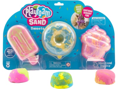 Serve up some scrumptious sensory play with this Educational Insights Sweets set of three reusable treat-shaped molds (cupcake, popsicle, and donut) with lids for easy storage and three swirly colors of supersoft Playfoam sand.