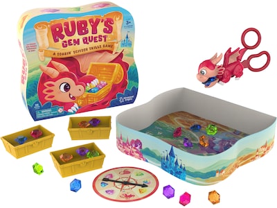 Sharpen those scissor skills with the Educational Insights Ruby's Gem Quest game. Help Ruby the Dragon collect gems from around the kingdom using the scissor scooper tool. Kids will learn how to properly hold scissors and develop the tiny muscles they need to do it. Includes a scissor scooper tool, 20 gems in five colors, spinner, four treasure chests, game guide, and a packaging that's part of the play. The inside of the box doubles as the game board.