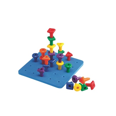 With 40 giant stackable pegs in 6 bright colors, 3 shapes and a 8.25"-square base, the EDX Education Co. Ltd. 8.25" Giant Peg Board is designed to instill basic math and reading skills in children. Playing with the peg set allows kids to improve their s orting, stacking, counting and matching skills to lay a solid foundation that can easily cope up with difficult math concepts. The peg holes can also be used to lace the peg shapes together to make learning a fun-filled experience. Moreover, the include d pegs have rounded edges, making them safe, easy to hold and fun to play with.