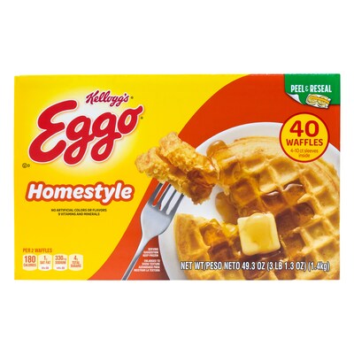 Wake up and greet the day with the feel-good taste of Kellogg's Eggo Homestyle Waffles. Includes one, 49.3-ounce box containing 40 waffles. Deliciously crispy and fluffy, our Eggo Homestyle Waffles are crafted with delicious ingredients. Pop these froz.en waffles in the toaster or oven for a delightfully crisp texture and the familiar, inviting taste of homemade waffles. Every serving provides a good source of nine vitamins and minerals.
