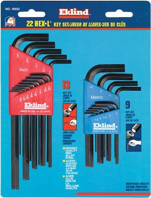 Eklind® Hex-L® 22 Pieces long and short arm combination hex key set has a size of 0.050" - 3/8" and is heat-treated for superior strength. Hex key set is made of 8650 alloy steel and is color coded compact holders.