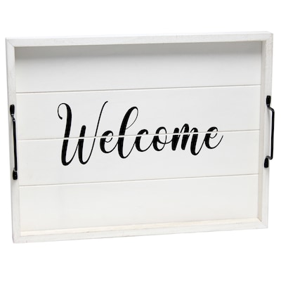 Elegant Designs "Welcome" Decorative Wood Serving Tray w/ Handles, 15.50" x 12", White Wash (HG2000-WWC)