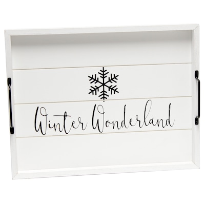 Freshen up your home with this white wash wood tray! Accented with black metal handles and black text beside a snowflake graphic, this tray is on trend to give your home that cozy farmhouse feel. Use to serve breakfast in bed, food and drinks at a party or makes for an excellent centerpiece for your dining table, kitchen counter, coffee table or ottoman.
