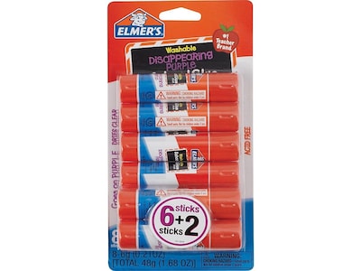 Apply adhesive exactly where you want it by using these glue sticks that spread on purple and dry clear. Formulated to wash quickly and easily from hands and clothes, these nontoxic glue sticks are safe for use in schools and offices. These Elmer's School disappearing purple glue sticks come in an 8-pack and are acid-free, making them perfect for archiving projects and long-lasting displays.