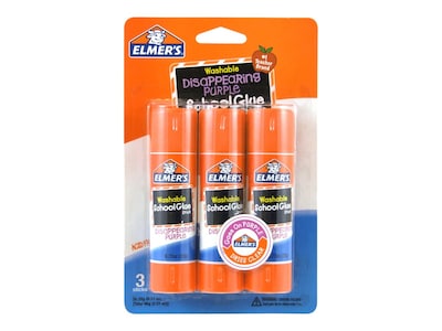 Set down an even layer of glue for paper craft projects by using these glue sticks, which apply purple but dry clear for a clean presentation. The adhesive in these glue sticks is non-toxic, acid-free and washable from hands and clothes. This pack includes three Elmer's Disappearing Purple glue sticks to supply craft cabinets in a school, home or office.