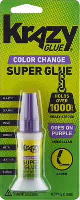 The Elmer's® Instant Krazy Glue® 0.18 oz color change brush-on glue offers an instant bond that stays strong on various surfaces such as wood, metal, ceramic, rubber, vinyl, leather and plastic. The brush-on applicator offers superior surface coverage that facilitates control on large surfaces and in hard-to-reach areas. It delivers the strong, easy to see, clear bond. The brush stays fresh in the no-clog bottle and the bristles of the brush do not stick together for hassle-free use.