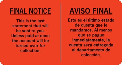 English/Spanish Collection Final Notice Pre-Printed Labels are pressure-sensitive for easy application. They keep patients informed of critical information through powerful messages in English and Spanish. They are available in 500/pack.