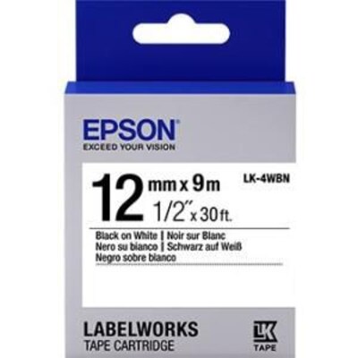 The Epson® LabelWorks™ LK-4WBN black on white standard LK tape cartridge is a durable, hard plastic casing for safe storage. It resists water, withstands hot and cold conditions and is suitable for everyday use. It features a split-back design for easy peeling and 30' of tape enables you to print more. It is suitable for use with LW-300, LW-300L, LW-400, LW-400L, LW-600P portable and LW-400VP, LW-700, LW-900P, LW-Z900FK, LW-1000P label printers.