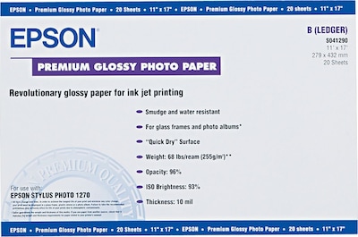 Epson Premium Photo Paper, 68 lbs., High-Gloss, 11 x 17, 20 Sheets/Pack
