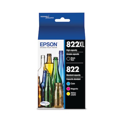 Epson T822XL/T822 Black High Yield and Cyan/Magenta/Yellow Standard Yield Ink Cartridges, 4/Pack (T822XL-BCS)