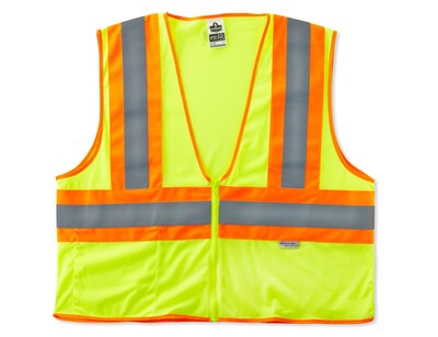 Ergodyne GloWear® Large/XL two-tone vest is made of durable polyester mesh in lime color with 2" high visibility reflective stripes to keep workers safe/seen in occupation where risk is high. Vest with zipper closure has pocket for convenience.