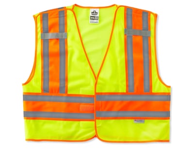 Ergodyne® GloWear® 8245 Large/XL lime public safety vest with radio tabs is made of 3.6 oz poly solid front and 3.3 oz mesh back for longer life. Vest in 5-point breakaway design has reflective set on 4 1/2" contrasting color background.