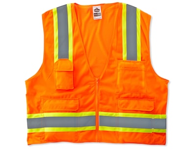 Ergodyne® GloWear® 8248Z Large/XL orange class 2 Hi-vis two-tone surveyor's vest with 2" reflective tape is made of 3.6 oz poly solid front and 3.3 oz mesh back for longer life. Vest with zipper closure includes 2 inside and 4 outside pockets.