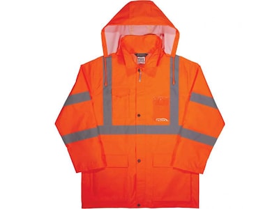 The Ergodyne GloWear 8366 lightweight high-visibility rain jacket is designed with waterproof materials (150D polyester oxford with a polyurethane (PU) coating) and fully taped seams for reliable protection in the face of stormy weather. This lightweight reflective rain jacket easily fits over workwear without sacrificing mobility. Fully taped seams are bonded to the jacket to keep water from sneaking in, while a vented cape back allows heat and moisture to escape for added breathability. An attached drawstring hood can be stowed away when not needed. Reflective tape on chest and arms adds visibility at night or in low-light conditions. It's the great lightweight, waterproof work jacket for those working in road construction, utilities, construction, emergency response, airline, railway, or survey crews.