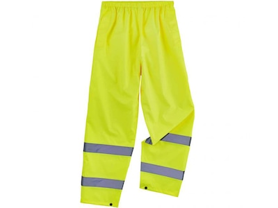 The Ergodyne Glowear 8916 lightweight high-visibility rain pants are Class E pants that provide protection against wet conditions while ensuring safety. An elastic waistband enables comfort to wear alone or over a base layer, with snap cuffs for easy on/off over boots. Built for demanding conditions, these pants are made with rugged yet lightweight waterproof materials and are fully taped at the seams for reliable protection in stormy weather. 2" reflective tape keeps workers highly visible at night or in low-light conditions.