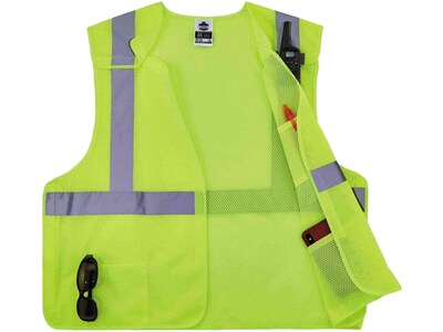 Ergodyne GloWear 8217BA Class 2 high-visibility safety vest is built with durable yet breathable ANSI/ISEA compliant polyester mesh and a five-point breakaway design for maximum visibility and protection against being caught in moving industrial equipment. This five-point breakaway vest (shoulders, sides, and front) is designed to harmlessly break away from the body in the event of mechanical entanglement. The rugged, durable 100% polyester offers resistance in tough working conditions with the strength to support extra weight in the cargo pockets. This high-visibility safety vest has a total of three strategically placed pockets. The open-top pocket on the lower right exterior is designed to carry tools, gloves, notebooks, etc. Two interior pockets, one upper left, flap open-top, and one lower left pocket, are great for field books, tape, pencils, cell phones, etc. Other features include an upper left mic tab, which can also be used to hold safety glasses/sunglasses or pens, and 2" ANSI compliant reflective tape for maximum visibility both day and night. This reflective safety vest is perfect for flaggers, airport baggage handlers and ground crew, road construction workers, forestry workers, high-volume parking attendants, toll-gate personnel, utility workers, shipyard workers, municipalities workers, and anywhere high-visibility clothing and apparel is necessary.