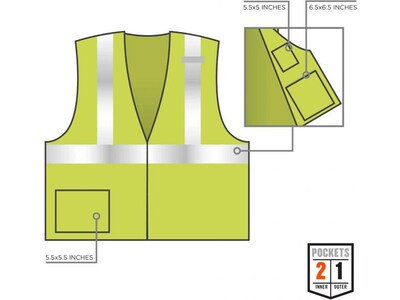 Ergodyne GloWear 8217BA Class 2 high-visibility safety vest is built with durable yet breathable ANSI/ISEA compliant polyester mesh and a five-point breakaway design for maximum visibility and protection against being caught in moving industrial equipment. This five-point breakaway vest (shoulders, sides, and front) is designed to harmlessly break away from the body in the event of mechanical entanglement. The rugged, durable 100% polyester offers resistance in tough working conditions with the strength to support extra weight in the cargo pockets. This high-visibility safety vest has a total of three strategically placed pockets. The open-top pocket on the lower right exterior is designed to carry tools, gloves, notebooks, etc. Two interior pockets, one upper left, flap open-top, and one lower left pocket, are great for field books, tape, pencils, cell phones, etc. Other features include an upper left mic tab, which can also be used to hold safety glasses/sunglasses or pens, and 2" ANSI compliant reflective tape for maximum visibility both day and night. This reflective safety vest is perfect for flaggers, airport baggage handlers and ground crew, road construction workers, forestry workers, high-volume parking attendants, toll-gate personnel, utility workers, shipyard workers, municipalities workers, and anywhere high-visibility clothing and apparel is necessary.