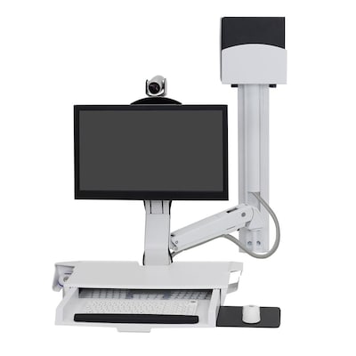 Let caregivers in your healthcare organization work sitting or standing with everything they need at their fingertips. This sit-stand combo system holds a monitor, barcode scanner, CPU, wrist rest and mouse, plus a sturdy worksurface and pull-out keyboard tray, all on the same height-adjustable arm. The pan-pivot feature moves the monitor up to 180° to easily share information with patients or colleagues and for an ergonomic fit that supports the best workflows (and comfort).