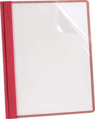 Esselte three-prong 100 percent recycled paper stock clear front and red report covers create a professional touch for your presentations and reports while also protecting the pages within. Metal fasteners hold papers punched with three holes for convenience and a standard fit, while each folder can take up to 100 sheets for large reports that don't necessarily need sturdy binding.