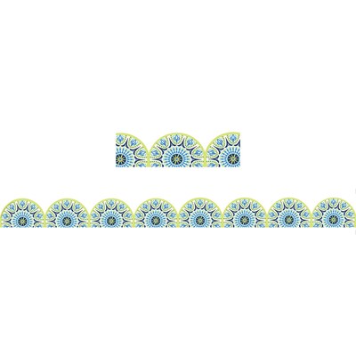 Use Eureka School Extra Wide Deco Trim to add a finishing border to your displays, windows, doorways or chalkboards. Vibrant colors plus a variety of styles and themes can add creativity to displays, windows, chalkboards and more. Blue Harmony Half Mandala Extra Wide Die Cut Deco Trim measures 3.25" wide, and each package contains 12 strips (each 37" long) for a total of 37 feet. Full color illustration printed on card stock. Fun die-cut edge detailing. Coordinates with the Blue Harmony Collection.