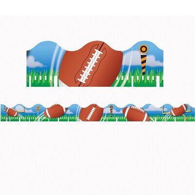 Energize the classroom and playroom with the striking Eureka Football Trims. Featuring lifelike football prints with scalloped edges, they are ideal for sports-themed decorations and are meant for repeated usage. Versatile in application, use it for decorating walls, framing doorways, windows and bulletin boards, or adding a creative touch to projects. These classroom trimmers are sure to delight students with their sports-inspired theme and colorful design.