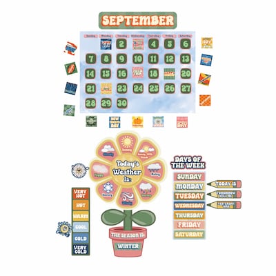 Eureka Bulletin Board Sets are a great way to add creativity to bulletin boards, hallways, walls and classroom space with fun designs and themes. Each 100-piece set includes 5 panels with: 1 giant calendar grid, 12 month headers, 33 dates, 37 special days, a days of the week header and chart with 3 indicators, 2 character indicators, and a 10 piece season and weather set.