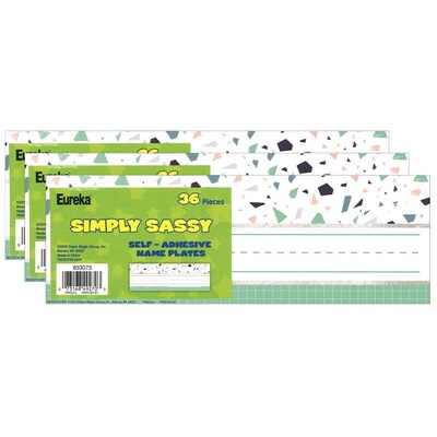 Showcase more than your students name! Eureka Self-Adhesive Name Plates provide a helpful visual reference with plenty of space for first and last names. Name plates are designed to stick to almost any surface and can be removed easily. Coordinates with the Simply Sassy Collection. Individual name plate measures 9-5/8" x 3-1/4". Each pack includes 36 name plates. Sold as 3 packs for a total of 108 name plates.