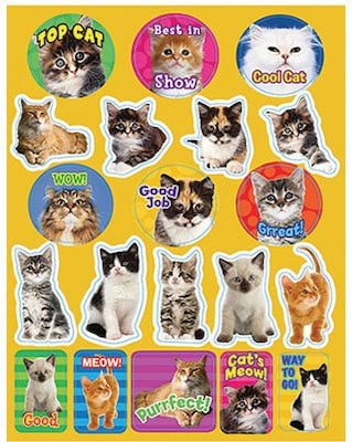 Eureka® Cats motivational stickers measuring 1" x 1" are self-adhesive. Stickers with many subjects are used to enhance teaching units or reward students, sold as 120 per carton.