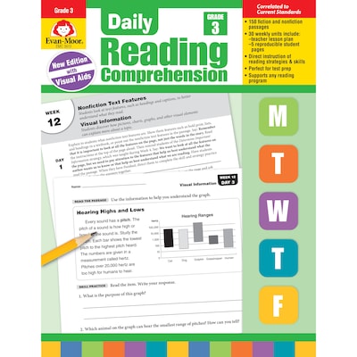 Help your third grade students learn how to understand, respond to, and enjoy what they read! Daily Reading Comprehension presents students with direct instruction and practice of the comprehension strategies and skills they need to become strong and successful readers. 150 original fiction and nonfiction passages with comprehension items help you engage students in reading, thinking about, and responding to a variety of texts. Reproducible pages, included in the teacher's edition, provide visual tools for students to help them apply reading skills to the passages they read. And because activities are presented in an exam format, students practice important test-taking skills while they strengthen comprehension. What's new in the revised edition"• Visual aid comprehension pages• Constructed response questions. Standards-aligned questions replace multiple choice questions.30 weeks of instruction cover the following reading skills and strategies:Skills:• Character and Setting• Main Idea and Details• Fact & Opinion• Visual Information• Author's Purpose• Making Predictions• Drawing Conclusions• Cause and Effect• Compare and Contrast• Nonfiction Text Features• Fantasy vs. Reality• SequencingStrategies:• Make Connections• Visualization• Organization• Determine Important Information• Ask Questions• Monitor ComprehensionYou'll love Daily Reading Comprehension because it...• provides students with direct instruction and practice of reading skills and strategies. • supports struggling and reluctant readers. • integrates easily into any language program and any classroom. • works great for test-prep. • is correlated to current standards. Engage your students in reading, thinking about, and responding to a variety of passages and texts with Daily Reading Comprehension!