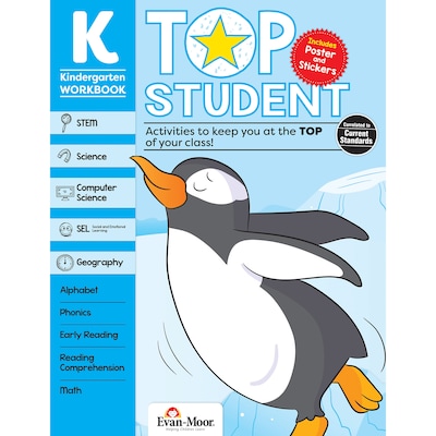 Provide young children a path to academic success with Top Student! This colorful activity book provides hundreds of creative and fun activities and practice pages that motivate young children to learn important reading, writing, and math skills!Top Student activities provide practice of the most important skills for each grade level, as well as opportunities for critical thinking and creativity. Colorful and creative practice pages and hands-on activities provide engaging practice to keep children motivated to learn! Core subject areas and topics include:• Alphabet• Math• Shapes, colors, and patterns• Phonics• Mindful moments• Early reading• Reading comprehension• Science• STEM• Geography• Social and emotional learning• Computer scienceThese robust workbooks also include:• Reward stickers• Informational posters• Mindful moments meditations and activities with downloadable audio. Mindful moments with audio help children incorporate reflection and meditation into their academic life.Includes answer key.