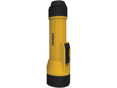 Carry this heavy-duty work-site flashlight to use in wet or demanding conditions. This flashlight features bright yellow corrosion-resistant polypropylene construction and has been water- and drop-tested for reliable functionality. This industrial flashlight requires two D-type batteries to illuminate spaces and provide a beam distance of 148 feet. With a built-in hanging ring, this Eveready LED industrial flashlight is convenient to carry or stow.