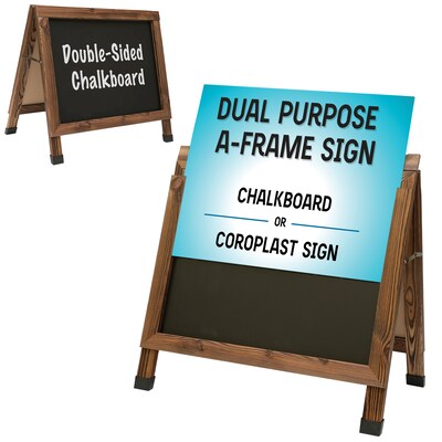 Introducing the Excello Global Products A-Frame Dual Purpose Chalkboard and Coroplast Frame Combo – a versatile and stylish addition to your advertising and messaging needs. This innovative A-Frame is carefully crafted to offer dual functionality, seamlessly combining a chalkboard and a coroplast frame for maximum impact. Here's why it's a must-have for your business or event: Elevate your messaging with the Excello Global Products A-Frame Dual Purpose Chalkboard and Coroplast Frame Combo. This 27-inch wide A-Frame stands 25 inches tall, making it the perfect canvas for your promotions, menus, or announcements. Crafted from furniture-grade hardwood pine with a rich natural dark brown finish, it adds a touch of sophistication to any setting. The legs of the A-Frame expand to 16 inches, providing stability, and are equipped with rubber feet for added grip, ensuring a secure display in any environment. The continuous top hinge and metal hinges on each side enhance durability and ease of use, making it a reliable choice for both indoor and outdoor applications. Each side of the 17x23 inch chalkboard boasts a smooth magnetic writing surface, allowing you to effortlessly create and update your messages. The top of each side conveniently opens to insert and securely hold a coroplast poster, giving you the flexibility to customize your displays with eye-catching visuals. Upgrade your promotional game with the Excello Global Products A-Frame Dual Purpose Chalkboard and Coroplast Frame Combo – where functionality meets style.