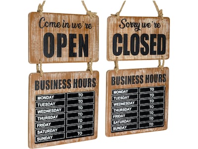 This Excello Global Products Business Hours chalkboard sign is made of durable wood with preinstalled strings in a distressed look that gives a rustic accent. Let your customers know that your establishment is open for business. The sign features an erasable chalkboard, so you can write the exact time so that your patrons know that you are around or not. The sign is perfect for commercial business environments such as restaurants, pubs, bars, and other business establishments.
