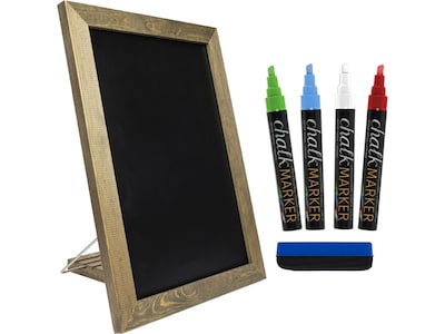This Excello Global Products indoor tabletop chalkboard sign is perfect for use in restaurants, cafes, bars, and more. The sign can be used to place menus, cards, name tags, table numbers, or to write messages, notes, prices, prayers, and more. The lightweight and simple to put up and down design allows you to take the sign anywhere you want. Display it in anywhere for highlighted products or food items, or notes and greetings. Great in your kitchen for jotting down notes, recipes, or messages for loved ones. So scribble, draw, and create with this tabletop chalkboard while also adding a lovely rustic decor. Comes with four liquid chalk markers.