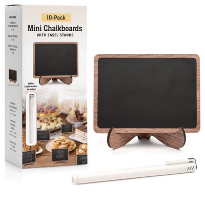 These mini chalkboards feature a dark brown wood-look frame and smooth writing surface, perfect for place cards, product labels, or table markers. Each 2.9" x 3.9" sign can be used vertically or horizontally and comes with a compatible marker. Includes 10 mini boards.